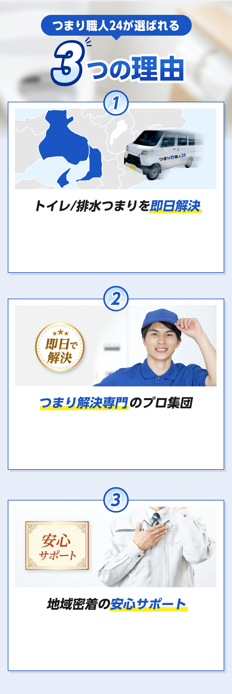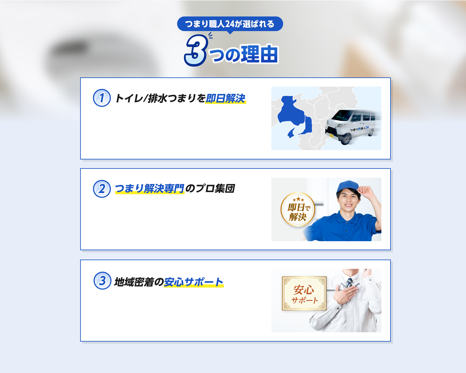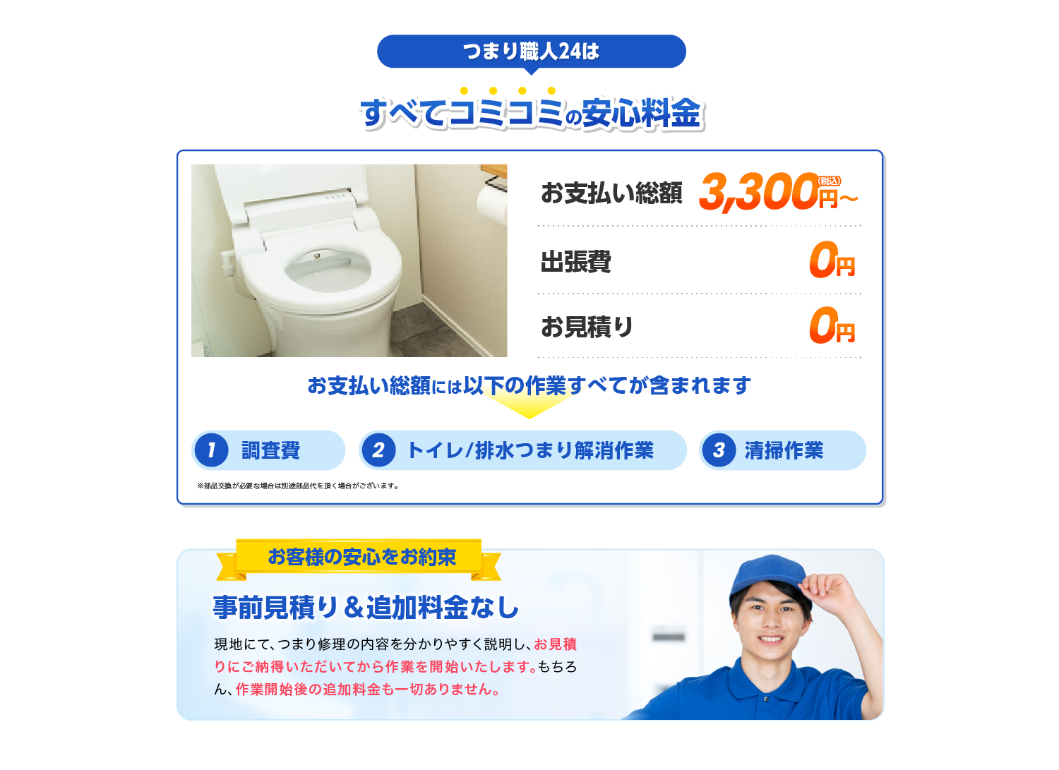 つまり職人24は、水道修理のなかでも特に「つまり」が専門の会社です。どんな手強いつまりでも必ず解決いたします。