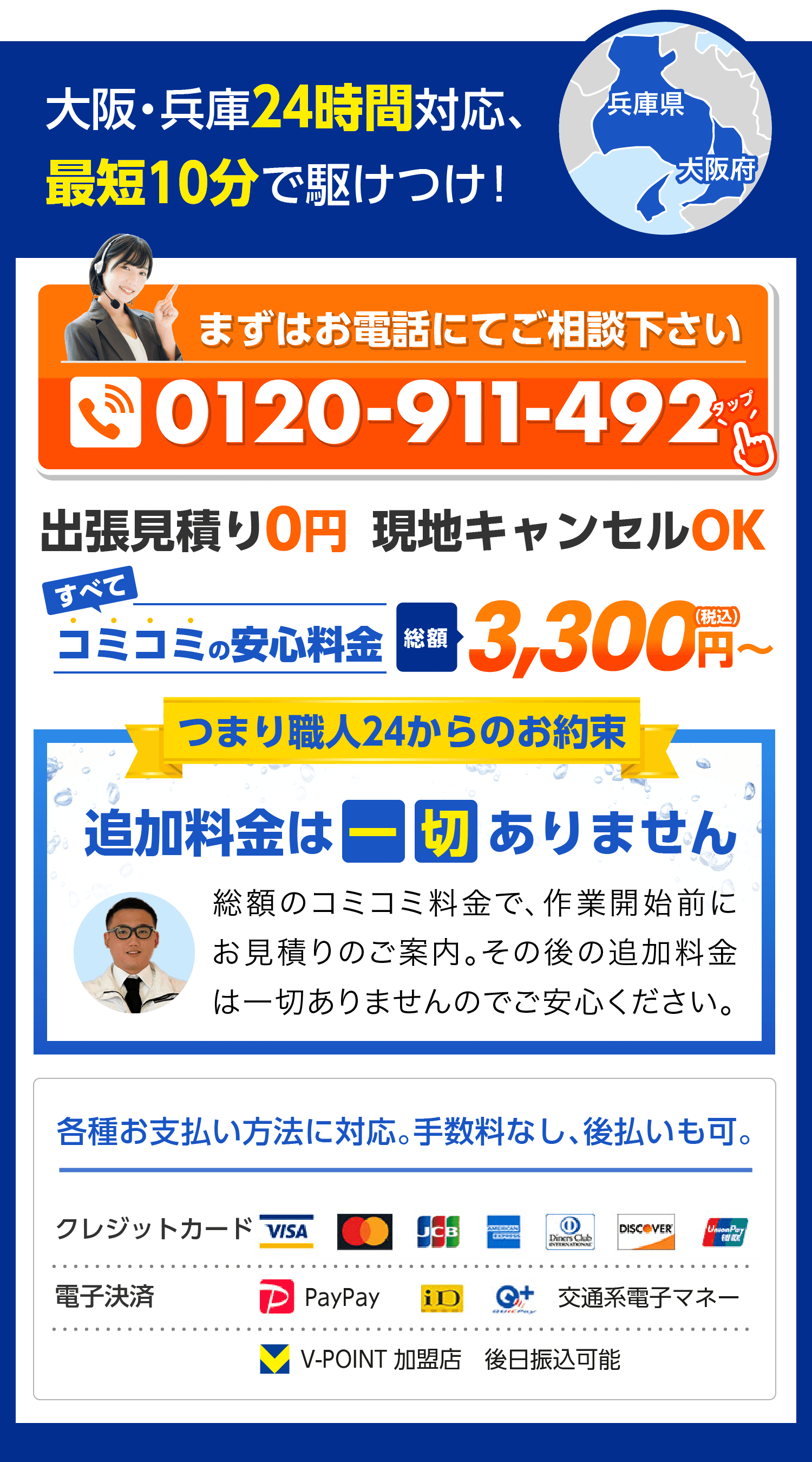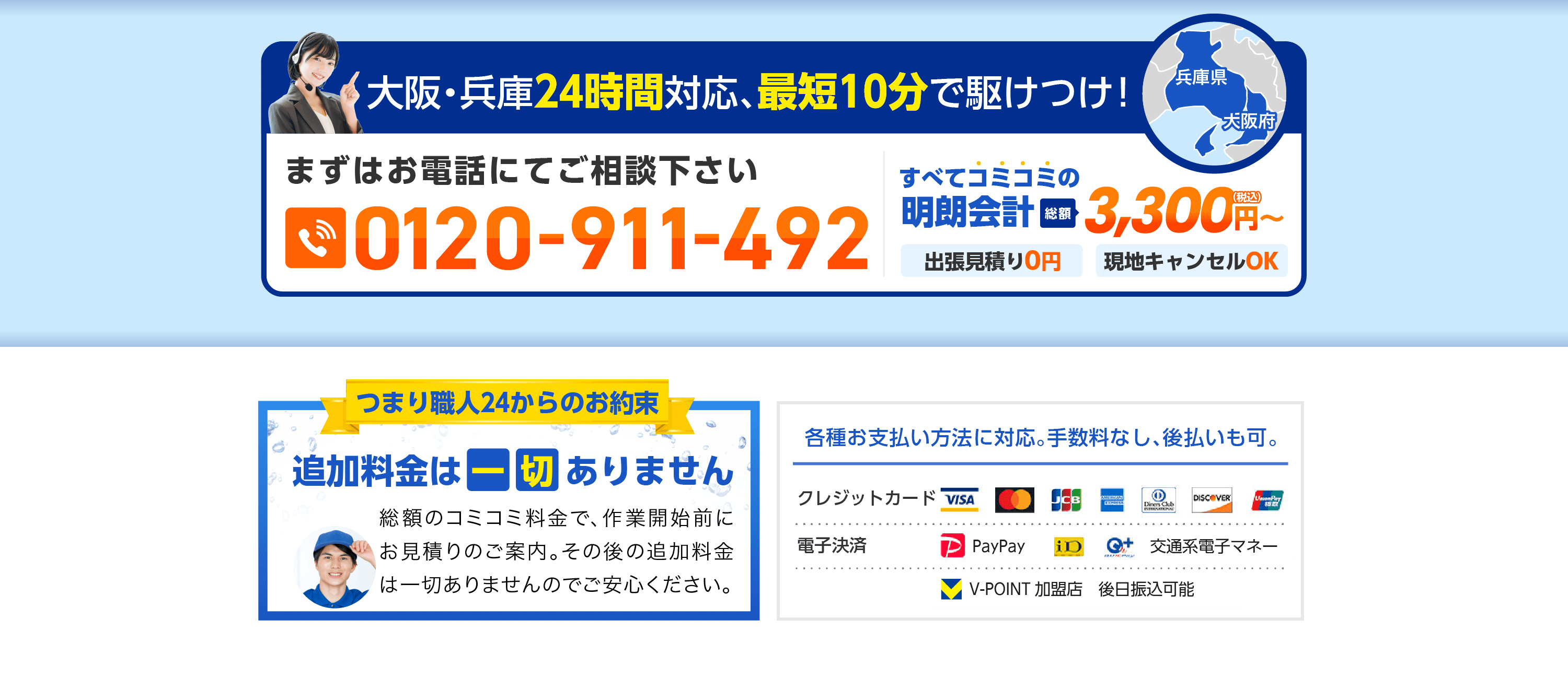 大阪・兵庫は、お電話から最短10分で現地にお伺いします。