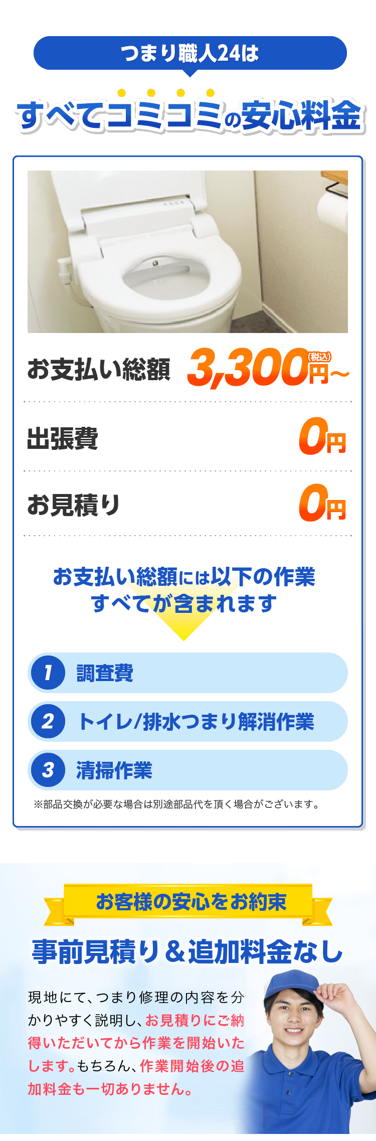 事前のご予約不要、即日対応のサービスです。お電話1本ですぐに駆けつけ、トイレ/排水つまりを即日解決いたします。